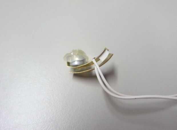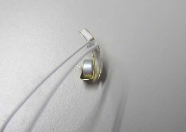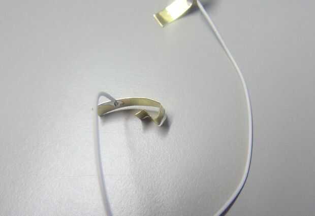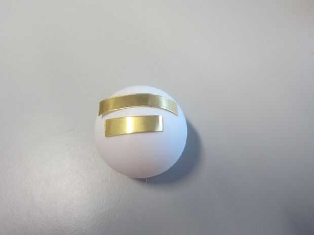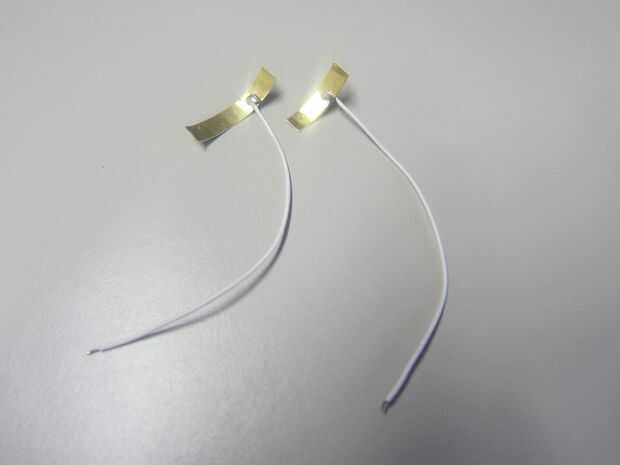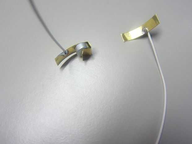 Tomar dos tiras de latón o bronce, aproximadamente 0, 5 x 6 x 22 mm y 0, 5 x 6 x 33 mm y doble a la curvatura de las bolas de ping-pong. Un plomo de 10 cm a cada franja, hacia los lados y dejando 5mm libre en el extremo de la soldadura. Un más largo a una forma de la curva como muestra, uno de los principales imanes de sujeción.
