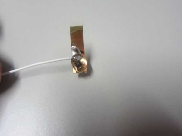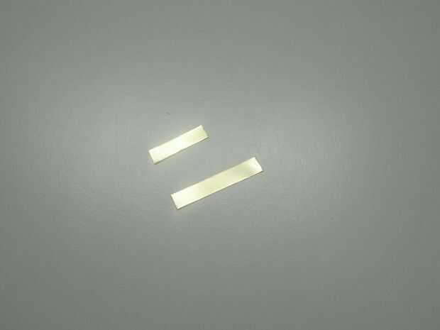 En los extremos cerca de cables de soldar, pegar las dos tiras junto con una separación de unos 3 mm, como se muestra. Alguna cinta de espuma doble cara es útil. Si no tienes disponible puede utilizar una gota de pegamento caliente en el que usted inserte una pieza de 3 x 3 mm de material de desecho (por ejemplo, el interior de un agujero de 3 mm lasered). Pulse a la vez (teniendo cuidado de no quemarse los dedos y dejar que el pegamento fije.
