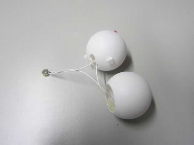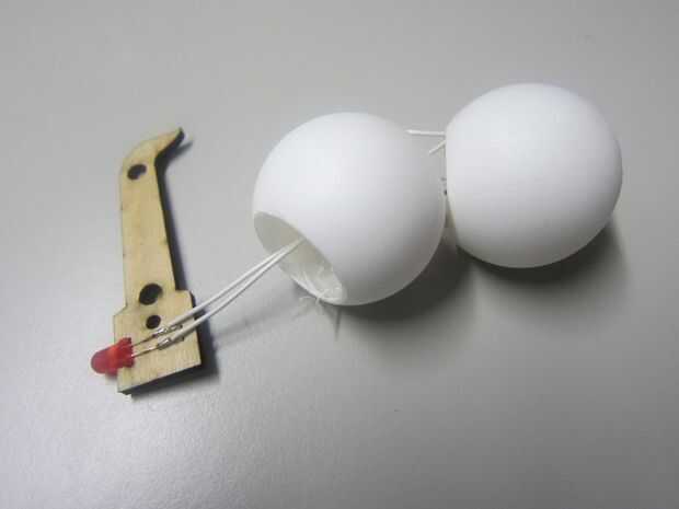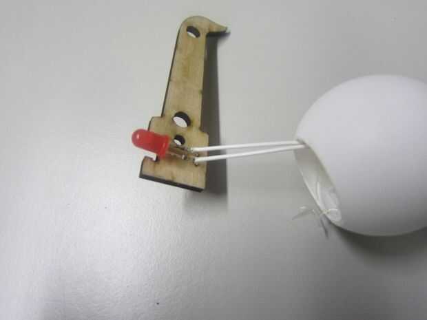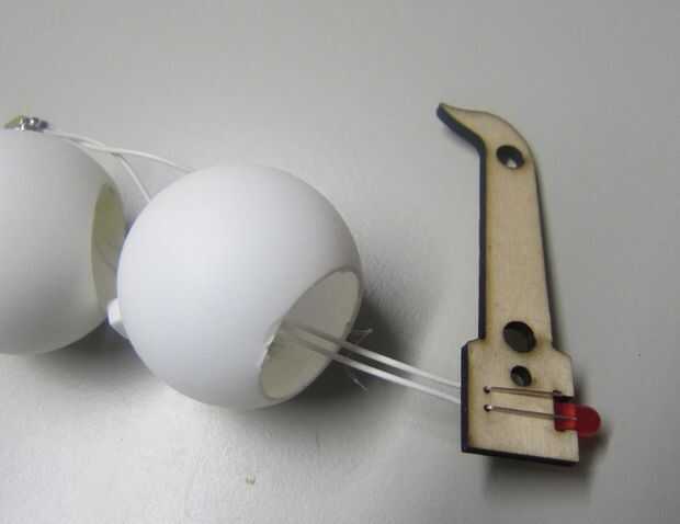 Como se muestra en la primera foto abajo, el LED y, pase del exterior al interior, a través de uno de los orificios superiores de un robot "cuerpo" (una de las bolas sin rostro y con almohadillas adhesivas en los "hombros"). Llevar el LED a través hasta que sale el gran orificio de la bola.