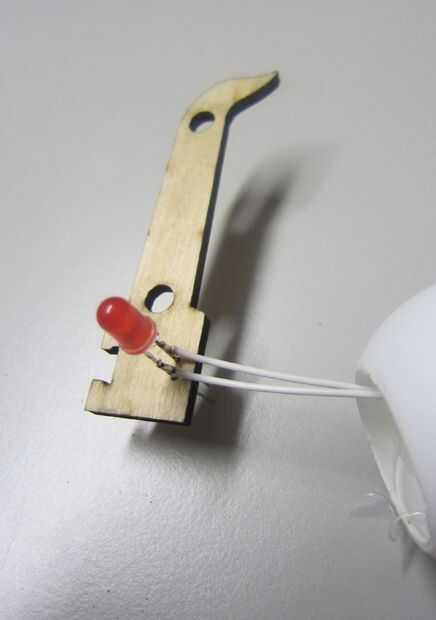 Poner puntas de pierna libre de LED a través de los agujeros pequeños en el extremo inferior de la parte del cuello. Si usted desea imitar la anatomía humana poner el LED en el lado izquierdo de la parte del cuello. De la curva, sin forzar un ángulo recto, para desplazar el LED en el cut-out en forma. Cuando el LED está en lugar de empujar las piernas otras en los orificios pequeños para formar una curva recta. También doblar extremos de la pierna de LED viene a través en el otro extremo, manteniéndolo todo en su lugar.