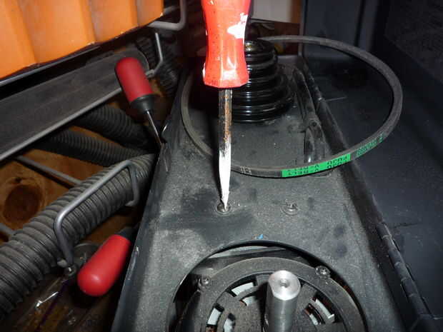 Para retirar el protector de polea, desatornille la placa de interruptor y quite los conectores de pala para liberar los cables. Hay cuatro tornillos que sujetan el protector de abajo y las dos presillas que sostienen los cables en su lugar. Eliminar a todos ellos y levante la guardia.