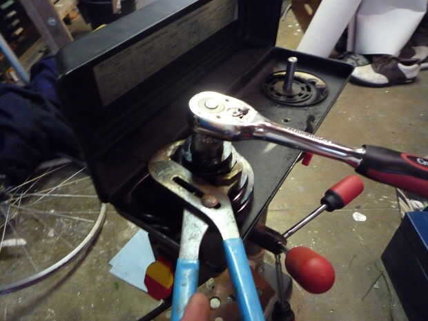 Es un poco más difícil, es presión en un eje de inclinación, entonces asegurado con un 24mm (15/32) mano izquierda tuerca polea (uno por encima de la tirada).