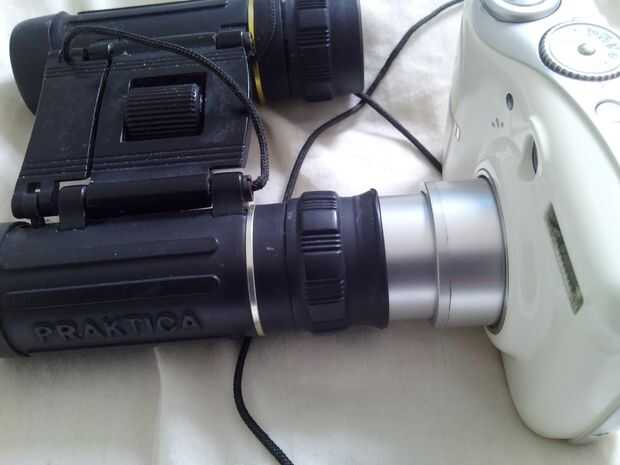 Insertar las lentes de la cámara en el borde de goma del tubo del ocular del par de binoculares