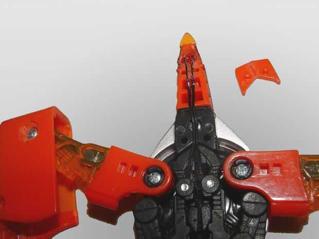 Prueba el LED con la batería. La soldadura de los cables de puente para el LED. Luego ponga una gota de pegamento dentro de cabeza de Laserbeak y el LED dentro de la materia.