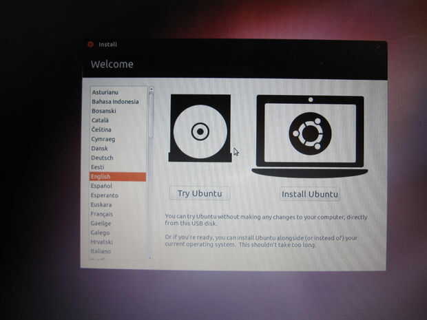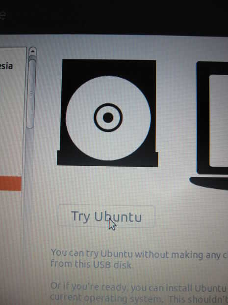 Debe llegar a un menú donde puede elegir su idioma y decidieron probar Ubuntu o instalar. Por ahora, vamos a elegir a Probar Ubuntu. Cuando ha cargado, tratar de hacer algunas funciones básicas.