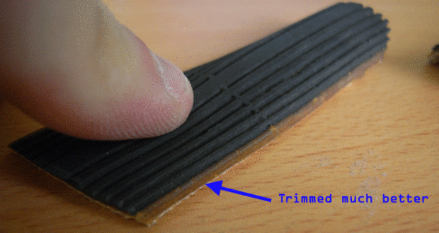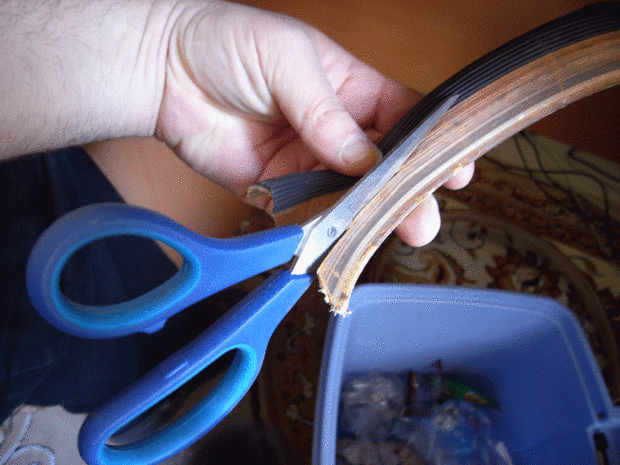 Ahora, corte la banda del goma parte del neumático de la pisada. Cometí el error de no cortar lo suficientemente lejos de la parte de "no contacto" neumático para las primeras tiras que hice. Después de eso, aprendí a cortar hasta la goma que cubre el camino de la llanta.