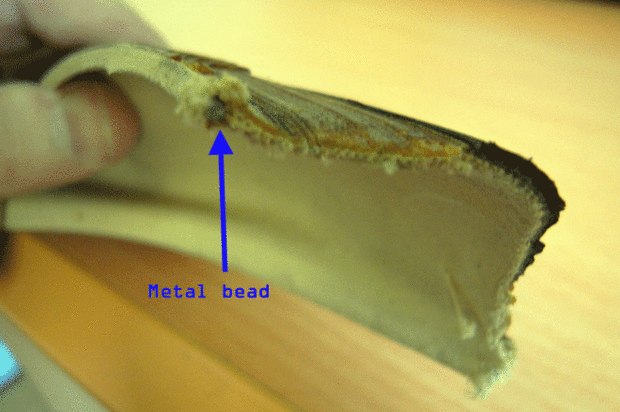 La mayoría de neumáticos tiene una tira de alambre de metal que necesita ser cortado. Con diagonal cuchillas o tijeras para alambre corte ambas bandas metal.