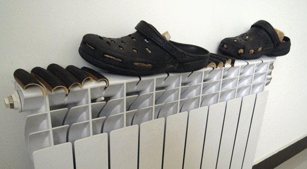 Coloqué los cocodrilos y las tiras de goma en el radiador.  Por favor tenga cuidado si haces esto.  Mantuve mi radiador baja, pero si está demasiado caliente, puede derretir el zapato o causar un incendio.