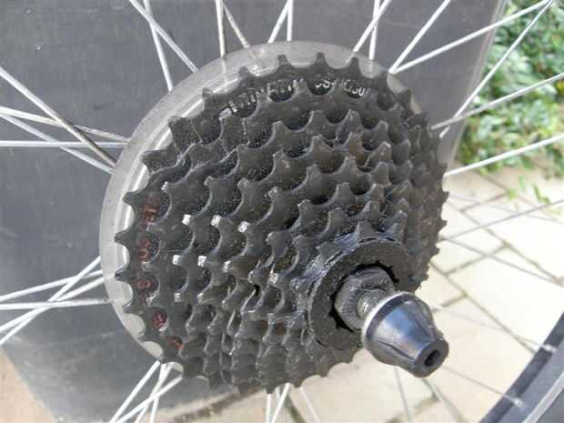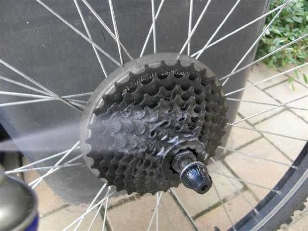 Deslice el trapo entre el piñón de primero y segundo, tomar sus manos y hacer un movimiento de corte de lado a lado, el cubo del piñón libre hace el resto del trabajo por nosotros. Trabajar su camino hacia abajo a través de todos los engranajes. Después de la explosión hacia fuera otra vez con WD40 y repita el proceso.