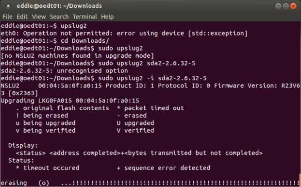 Ahora tienes que escribir la imagen de firmware Debian en el NSLU2. Usted puede hacer esto con upslug2, una herramienta para Linux y Unix que puede utilizarse para escribir una imagen de firmware en el NSLU2 mediante la red (el programa está empaquetado para Debian).