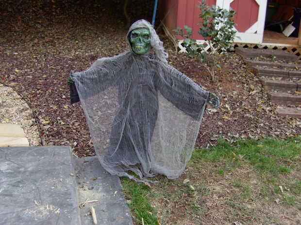 - La estaca debe caber dentro de la cabeza de la figura (una cabeza de Halloween es común en colgar figuras)