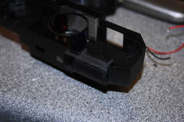 Usando una combinación de un cuchillo afilado y sus pinzas e incluso una sierra de marquetería, ampliar el visor trasero para acomodar al soporte de la batería.