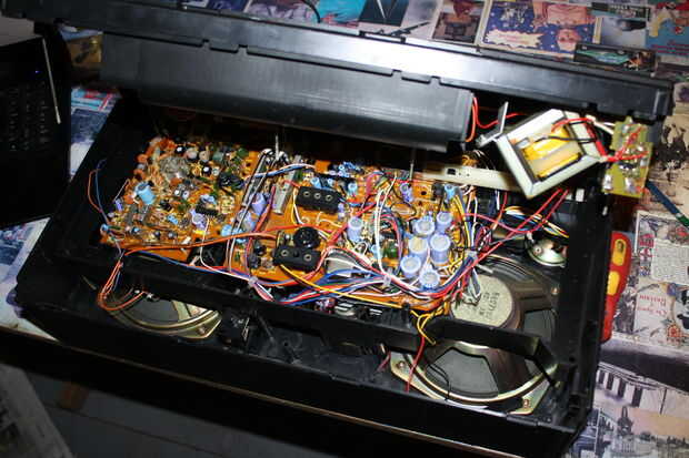 Mi plan original era quitar todo lo del boombox. Pero mucho de los switches y controles fueron Unidos directamente a la placa de circuito. Así que en vez solo corté todos los otros cables para hacer las cosas un poco más fácil. También quité el transformador y algunos otros bits que podría, para hacer la cosa más ligera.