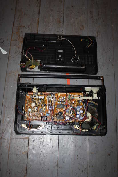 Había unos cables que unen la parte trasera a la parte principal de la boombox. Después de comprobar que estos no eran para los altavoces yo apenas había cortada les por lo que pude eliminar completamente la parte posterior.
