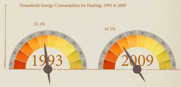 en 1993, la calefacción (no incluyendo el uso de calentadores de agua) representaron 53.1 por ciento del consumo total de energía en los hogares de Estados Unidos. En 2009, calefacción representaron el 41,5 por ciento del consumo total de energía. La disminución en el gasto se puede atribuir a varios factores, incluyendo el mejor aislamiento, avances en la eficiencia de la ventana y personas hacia zonas más cálidas. Tener una habitación más caliente no necesariamente significa gastar más en uso de energía.