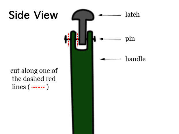 La primera cosa a hacer es quitar el seguro viejo. Utilicé una herramienta Dremel con un disco de corte de servicio pesado. Para hacer esto, usted cortará el perno que sujeta el pestillo a la manija. Para obtener mejores resultados debe cortarlo en el interior del marco. Si no puede montar el disco de corte allí entonces usted debe empujar el perno de un lado y corte en el espacio exterior. Después de que han cortado el pasador el pasador y el pestillo deben deslizarse hacia fuera fácilmente.