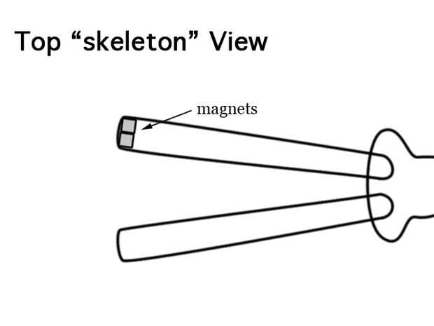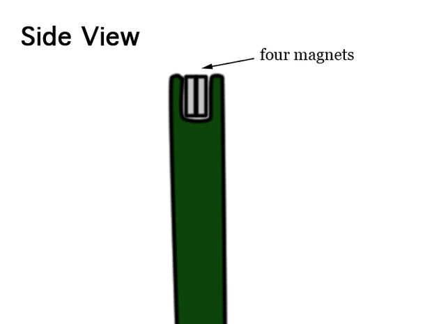 Luego tendrá que colocar los imanes. He utilizado cuatro imanes de neodimio cuadrados de ThinkGeek «Curiosamente fuerte imán.» Debe tomar cuatro imanes y junte a lo largo de sus lados planos en dos grupos de dos. Luego coloque los dos grupos juntos a lo largo de los lados más pequeños. Finalmente Coloque los cuatro imanes dentro de una de las asas. Esto probablemente requerirá paciencia y probablemente necesitará a moler un poco del interior de la empuñadura para conseguir que encajan perfectamente. Una vez que tengas bien en su lugar debe poner unas gotas de epoxi sobre ellos para mantenerlos en forma segura. Asegúrese de no poner el epoxi en demasiado densamente o los imanes no tienen una buena sujeción magnética.