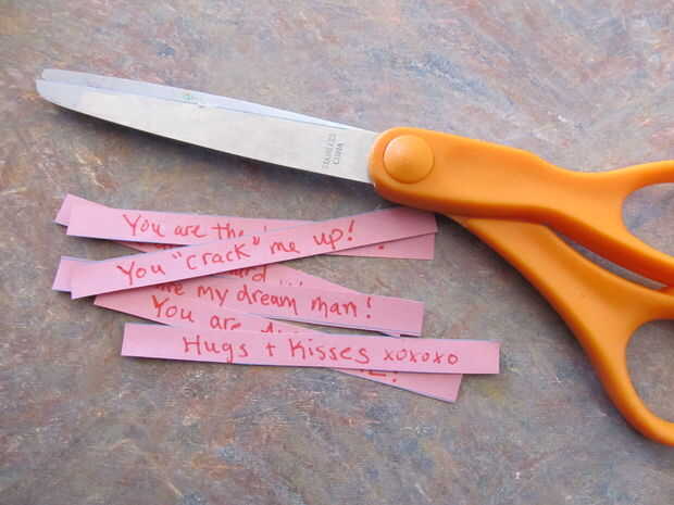 ' Tome su lápiz y papel y escribir una lista de refranes pegadizos, felicitaciones, algún dulce o cosas que admira sobre la persona. No intentar hacer tu escritura más grande entonces aproximadamente 1/4". Desea que caben fácilmente en las cáscaras.