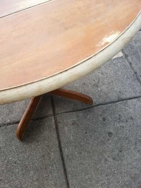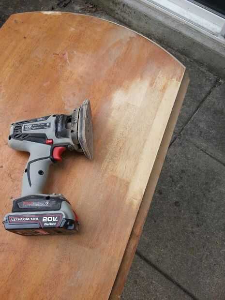 Saltar derecho en el proyecto, quería quitar el acabado antiguo que estaba sobre la mesa. En algún momento, varios puntos en la tabla tienes pintura en él. También quería Retire antes de repintado la tabla por lo que no tienen marcas extrañas bajo la nueva capa de mancha. Empecé a lijar la parte superior de la tabla con la lijadora de Palma y el borde con la herramienta dremel con un tambor de lijado. Desde el principio me di cuenta que lijar mientras aún estaba montada iba a ser más problema que merece la pena. Desarmar la mesa haría el proceso más fácil.