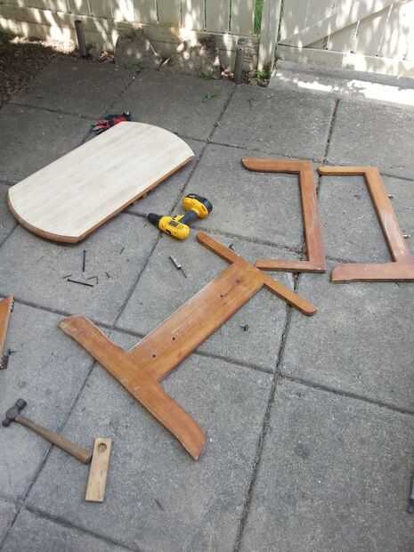 Una vez que decidí desarmar la mesa, se trataba de quitar los tornillos de las patas de la mesa para quitar la parte superior. La parte superior era solamente ser celebrada por seis tornillos como el resto o bien había caído hacia fuera o no fueron nunca jodido en. La columna de la tabla se llevó a cabo conjuntamente por dos pernos largos y pasadores de madera incrustadas en las piezas. También tomó las porciones abatible de la mesa principal y quitar las bisagras. Estaban oxidados y en forma bastante áspera y puso a un lado para más tarde. Todas las tablas puede variar, así que si usted sigue este insctructable, mi único Consejo es si su tiene un tornillo, sacar.