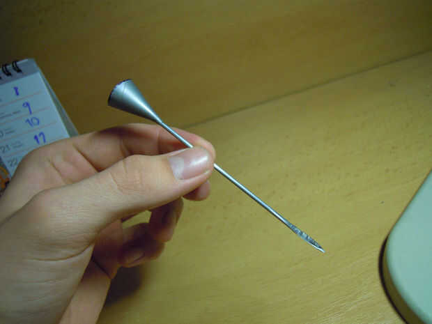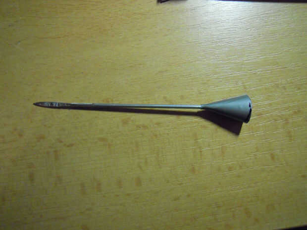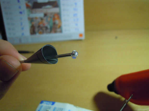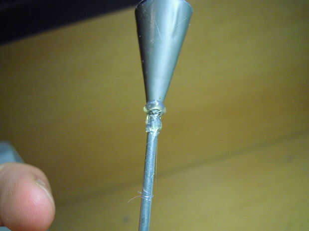 • Aplique una pequeña gota de hlue en el extremo embotado del rayo y presione el cono a la gota de pegamento. Ten cuidado, no deje el resbalón del cono en el habla, deja cierta reserva (1 mm). También recomiendo aplicar una muy pequeña cantidad de pegamento alrededor de la línea donde el rayo se encuentra con el cono. Mantener centrado el cono hasta que el pegamento se solidifica.