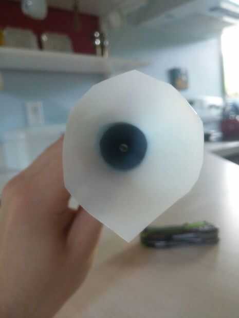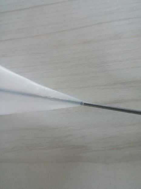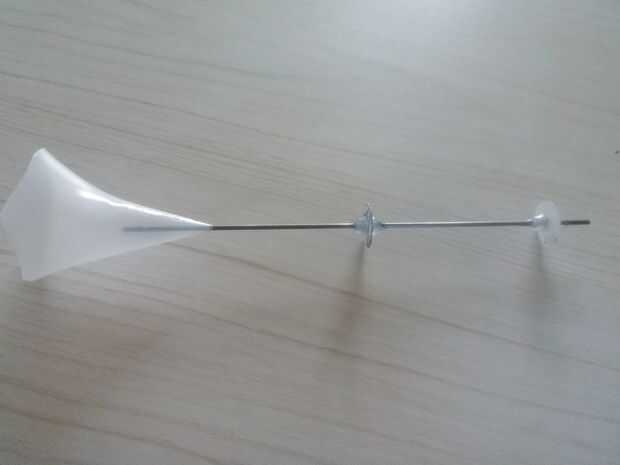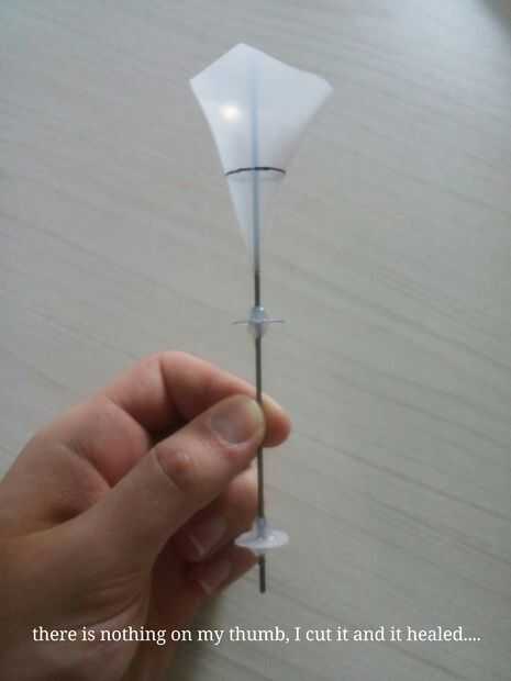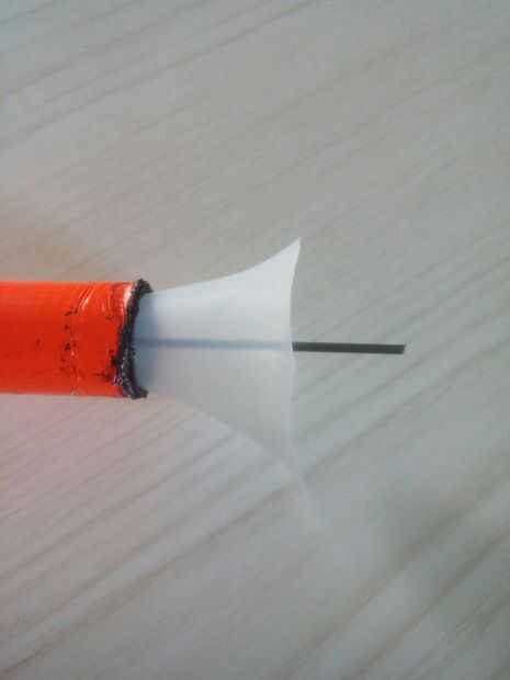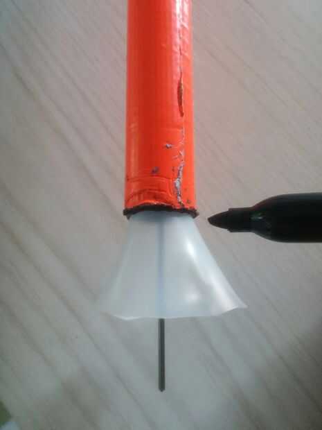 Primero quiere pinchar la punta del cono pulsando el alambre a través de él. Coloque el cono sobre la plantilla y deslice todo dentro del extremo de la cerbatana. Después de comprobar que el cono está centrado en la pistola, y que el borde de la pistola en contacto con el cono, seguir adelante y marque donde usted quiere cortar el cono con el marcador.