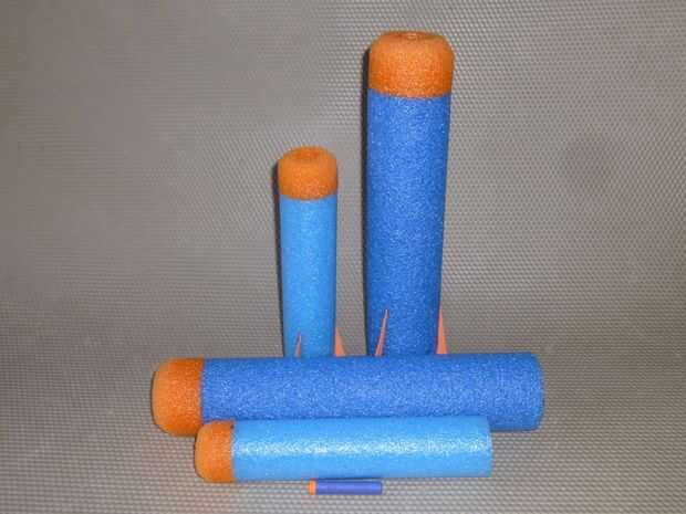 Hice algunos dardos de NERF gigante para una fiesta de cumpleaños. Originalmente diseñado para"decorativo", están entendiéndose con la adición de un lanzador como el de (NightHawkInLight).