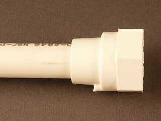 2. Pulse en, pero no de cemento, un adaptador hembra de 1/2" en un extremo de la sección 3' de CPVC de 1/2". Tratar de encontrar el adaptador hembra que tienen una arandela de goma en el interior del gran final. Si no puede encontrar uno, comprar uno. Debe ser 3/4" OD y 1/2 ID y 1/8" de espesor. La lavadora ayuda a evitar que el dardo salga. Esto forma la pieza de boca.