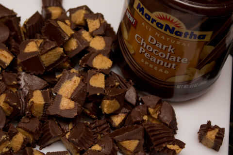 Preparar mortero una cacerola de 9 "x 13" y picar hasta tazas de mantequilla de cacahuete de Reese chocolate oscuro en cuartos hasta obtener 1 taza. Ponga a un lado. (Si no se encuentra a oscuro chocolate Reese, puede usar los originales, no digo.)