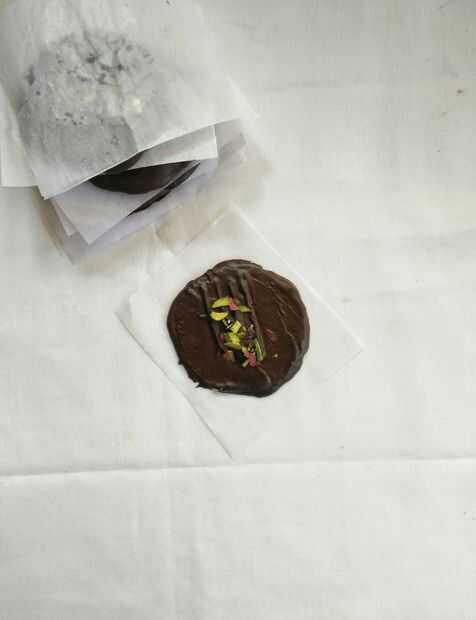 2) en este punto, puede rematar con las nueces picadas, pétalos de rosa secos machacados, grageas, etc.. También puede dibujar patrones con un tenedor cuando el chocolate es la mitad del conjunto. Deja endurecer totalmente antes de guardarla en un recipiente hermético.