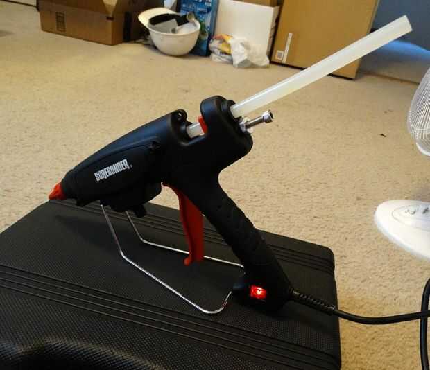 Calentar la pistola encoladora caliente. Asegúrese de que está en una superficie de trabajo segura y nivelada.