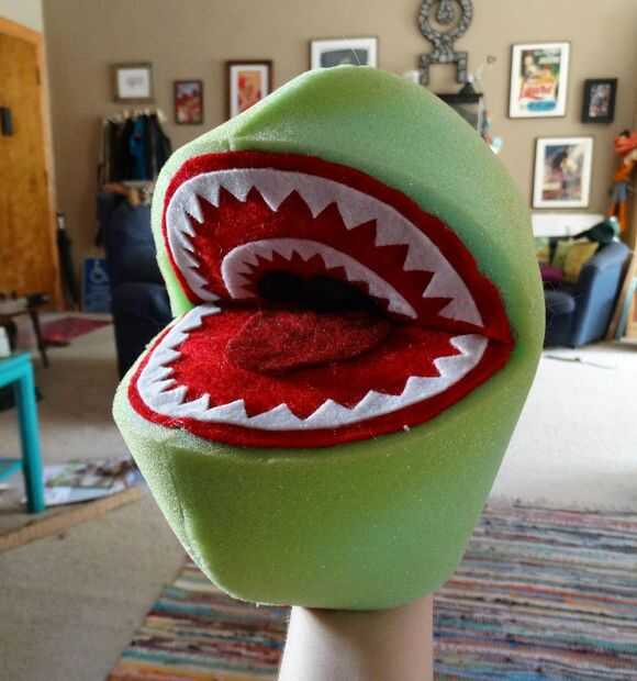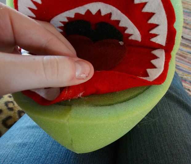 Para probar el ajuste de la boca, simple empuje todo el orificio de la boca al revés. Las piezas de la cabeza y la boca de espuma deben encajar perfectamente. El margen de costura extra de su rojo fieltro debe quedar al ras en la parte superior los "labios".