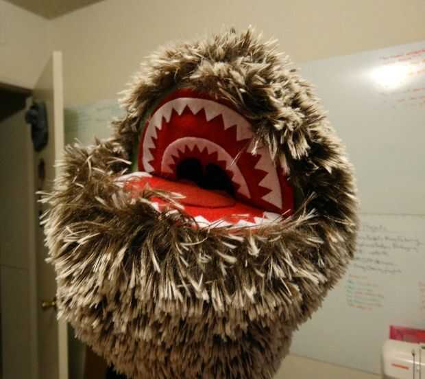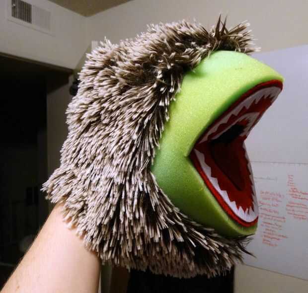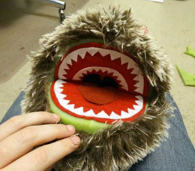 a la piel su marioneta, la forma de la marioneta de espuma en a través del orificio de la boca abierta de la tela de nuevo. Tire suavemente de la piel de encima hasta que los labios de la piel encontramos los labios de espuma correspondiente. Todo debe encajar muy bien--no demasiado flojo y no difícil o apretado.