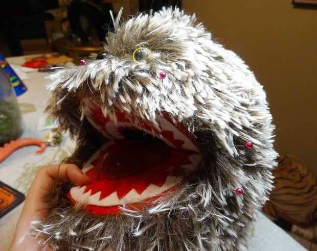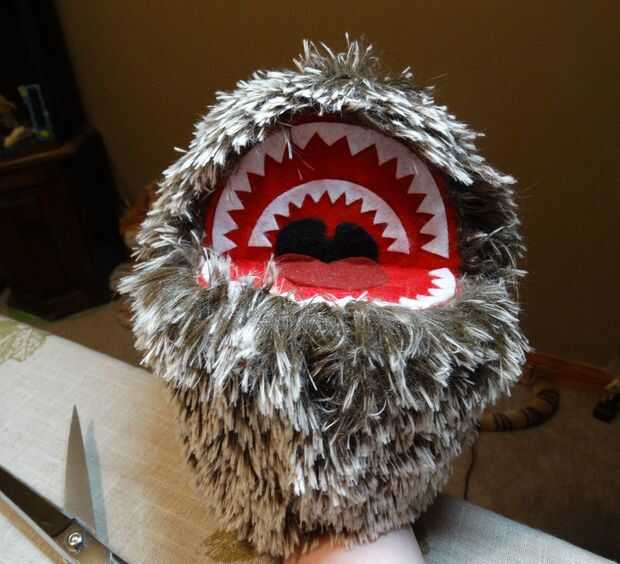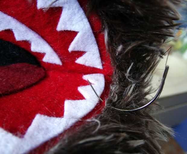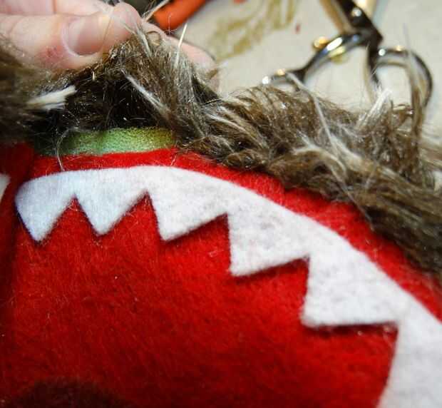 Para garantizar la piel en el lugar y cubrir los últimos restos de la espuma, a coser todo el camino alrededor de la boca. Esto es donde entra ese fieltro extra rojo.
