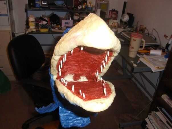 Luego añadí los dientes de un collar cavernícola. Para ello, cavado pequeños agujeros hasta la lona plástica, addad un poco de pegamento caliente, luego los dientes recubiertos con una capa de látex líquido, cerrar la costura de los agujeros de los dientes. Después de la pintura, látex se extrae de los dientes. látex también se aplica a la costura en el interior pedazo de boca cumple con el resto de la cabeza del títere.