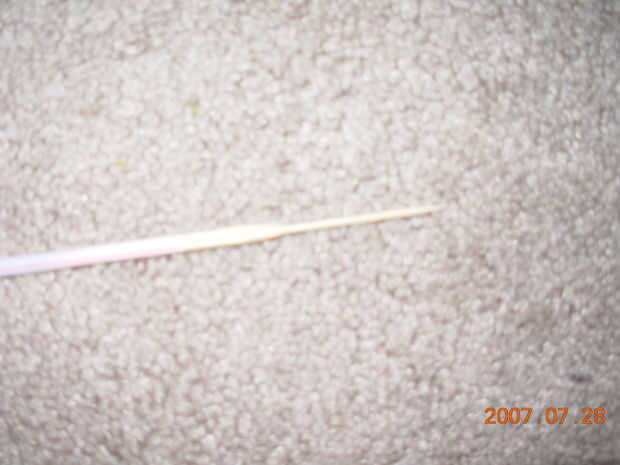Por último, coloque con cuidado el palillo pasado en medio de los otros en la paja. cinta esta abajo con cuidado ya que es la parte más difícil. Tratar de que el palillo que no balancea demasiado cuando empujas un poco.