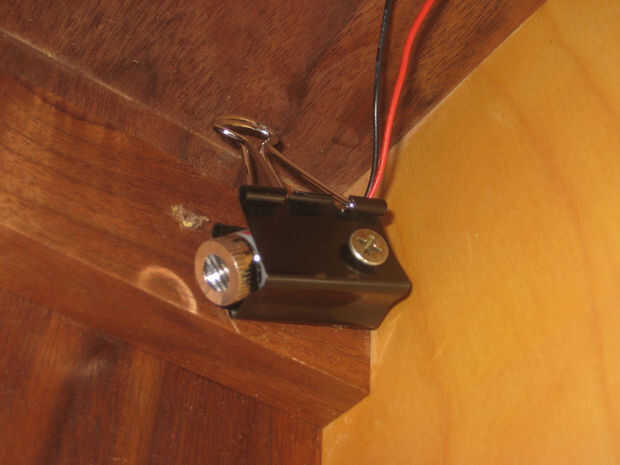 Elegí la esquina superior izquierda de mi gabinete, ya que era un área no utilizada, tenía un montón de material a perforar para montar el láser y fue apagado al lado del centro del gabinete. También quería que el módulo del laser en un lugar donde no ser golpeado por un dardo y haz roto o golpeado sueltos. Si el láser se coloca sobre el tablero de dardo en el centro entonces cuando personas más cortas caminar hasta el centro del gabinete para eliminar sus dardos se Haz arruinados en los ojos con la luz del láser. Si el módulo está apagado al lado entonces hay menos posibilidades de ser golpeado en los ojos con la luz del láser.