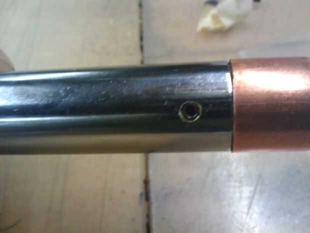 Perfore un pequeño agujero 1/4" desde el borde de la manga cromo pasando por ambos lados de la manga de cromo y la tubería de cobre.