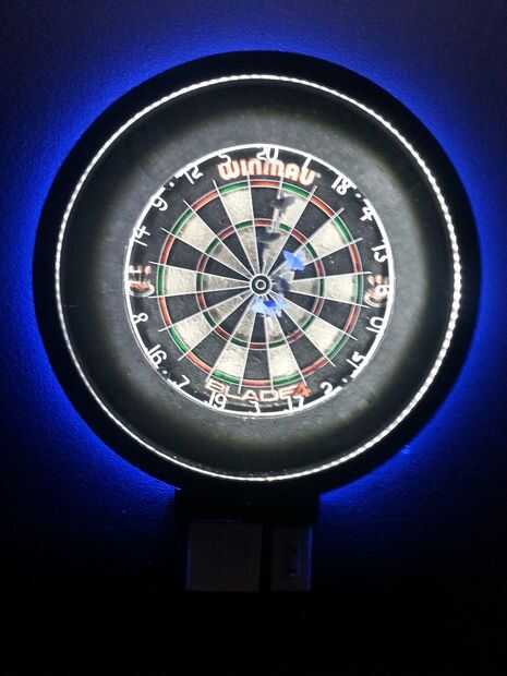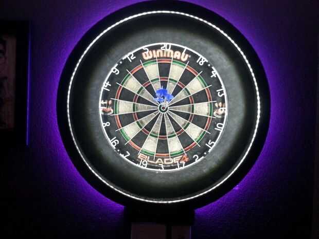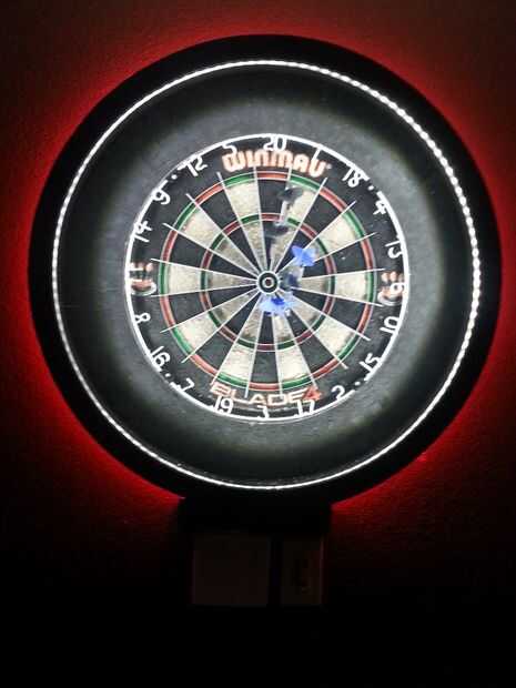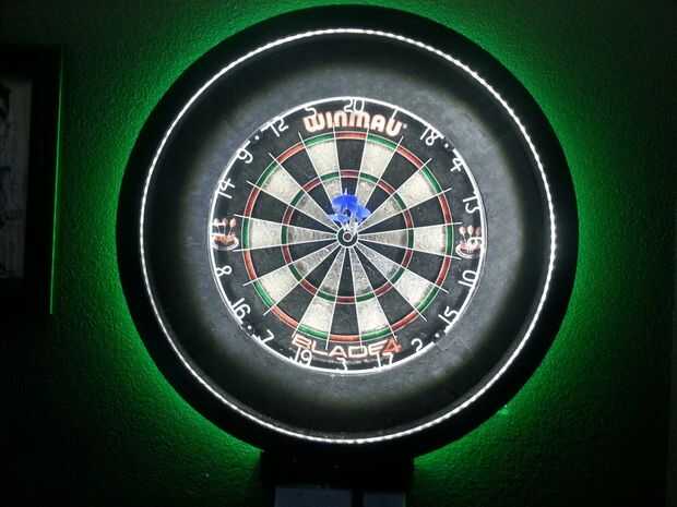 Dardos necesita buena iluminación y focos tradicionales o ambiente habitación iluminación sólo no es suficiente. Así que, después de buscar lo que estaba disponible y lo que otros han hecho en el mundo, terminé con la mejor solución para hacer mi propia luz de Dart. Resultó mucho mejor de lo que aún estaba esperando! Esta envolvente de Dart luz es tan brillante como lo quiero ser, más moderno que el tradicional busca gabinete y muy fresco! Y además de todos los colores y modos de iluminación, que usted puede elegir, el blanco centro LEDs proporcionan 360 grados de luz clara que se centró en los dardos que elimina sombras por dardos que aborrecen todos los jugadores. Esto realmente hará que quiere jugar a los dardos!
