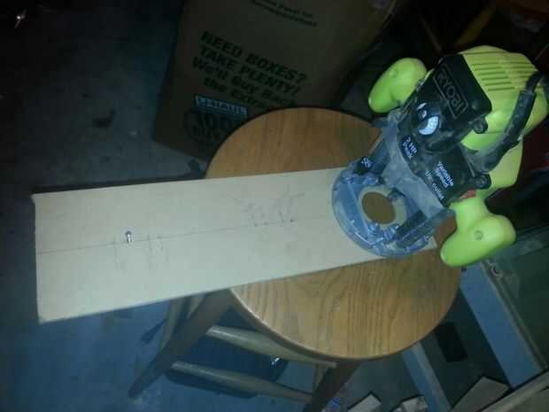 Para describirlo brevemente, la plantilla es simplemente una tira fina de madera de desecho que se montan en la parte inferior de tu router. (Aviso que usted necesita cortar un agujero para la broca de fresadora recorrer y usted necesitará también Perfore unos agujeros para que los tornillos en la parte inferior de tu router se alinearán con la plantilla demasiado así que usted puede adjuntar la plantilla.) En el otro extremo de la tira de madera, inserte un tornillo que será el punto central de todos los círculos que se corta. Para hacer cortes de círculo de diferente tamaño, sólo tienes que cambiar la distancia entre la broca y el tornillo al mover el tornillo a la longitud deseada de la broca de fresadora. (Esto es por eso que veas varios agujeros alrededor del tornillo en mi foto). La distancia entre la broca y el tornillo es el radio del círculo que está haciendo. Así que si quieres un círculo de 28", necesita tener una distancia de 14" pulgadas de distancia entre la broca y el tornillo. Una vez que el tornillo medido para el círculo de tamaño que usted quiere cortar, a poner su conjunto router/plantilla sobre la madera que está cortando y atornillar el tornillo en el punto central de donde desea que el círculo para cortar. Entonces después de comprobar el router no se quede sin madera y van más allá de cualquiera de los bordes, usted encienda la fresadora, empuje hacia abajo en la madera para proceder al corte y entonces lentamente gire el router/posicionador en un círculo hasta su corte es completo.