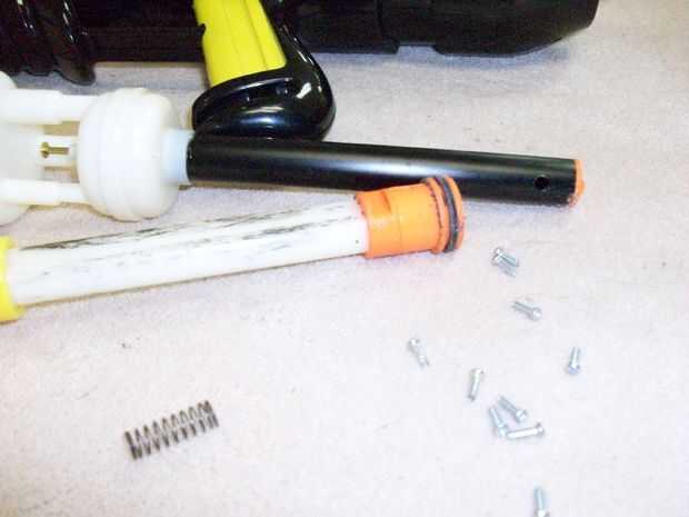 Tomar todos los tornillos que sujetan el caso apagado. Luego tomar la cosa adentro hacia fuera. Este es el arma principal. Si era viejo y roto entonces asegúrese de que aún puede disparar por bombeo y leña seca. Si no escuchas la distinta corriente de aire, olvídate de este proyecto.