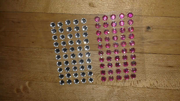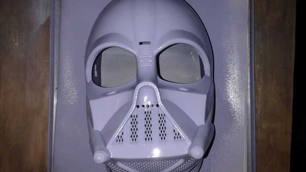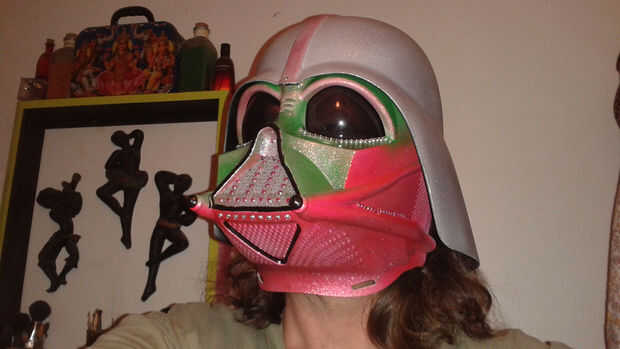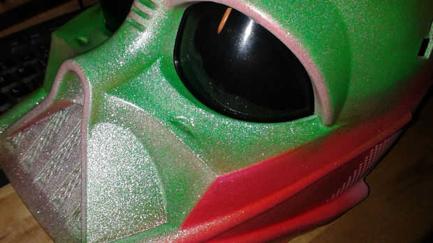 Le di la máscara de una capa de Lila en un acabado satinado. La pintura fluorescente es translúcida por lo que una ligera capa de color base me alegra un montón. Luego dio todo un par de capas de color rosa fluorescente. He cubierto la superficie superior de la máscara con verde fluorescente y resaltan con glitter Plata. Me puso de relieve la parte inferior con purpurina rosa y rellena la rejilla de la boca y nariz con glitter Plata. Cuando todo se secó selló la máscara todo con triple espesor esmalte y deje secar otra vez. Desde que terminé con la pintura en aerosol, he reinstalado la lente y había añadido detalle negro en el borde de la parrilla y las dos protuberancias. También he añadido piedras de la gema adhesivo para acentuar la parrilla, la línea del ojo y el cuello.