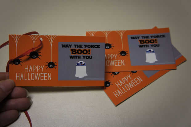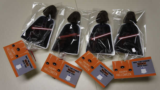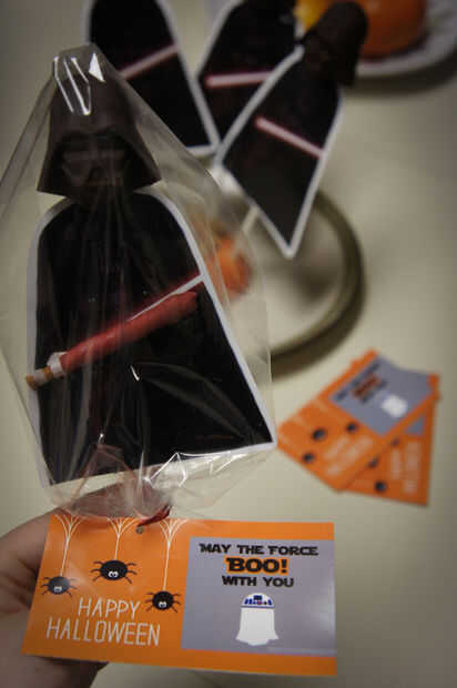 Coloque un pop de Darth Vader en una bolsa de regalo. Cadena 'Feliz Halloween' de la etiqueta de una cinta y atar la bolsa tratamiento cerrado.