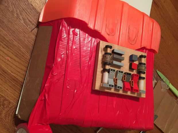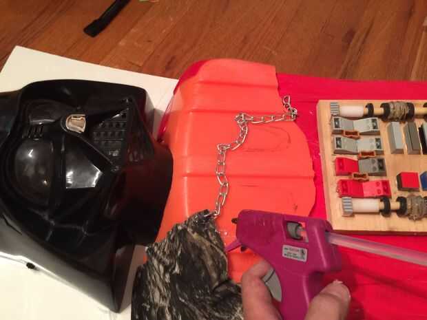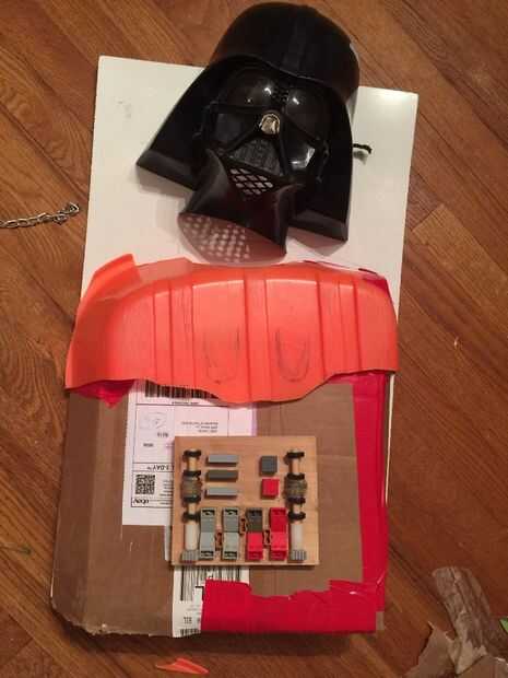 Organizar todas las piezas en un tablero para hacer el proxy de Darth. Corte un viejo trineo roto para crear el panel del pecho en su conjunto. También caliente pegué algunos remaches antiguo, Studio fabricante de piezas, Lego y otras probabilidades y termina de una papelera en el garaje en una tarjeta para crear algo que parecía su panel de control para su pecho. Una cadena antigua y algo de tela funciona bien para su capa. Una pequeña cinta del conducto también ayuda a mantener todo Unido y crear un aspecto agradable de la tela.