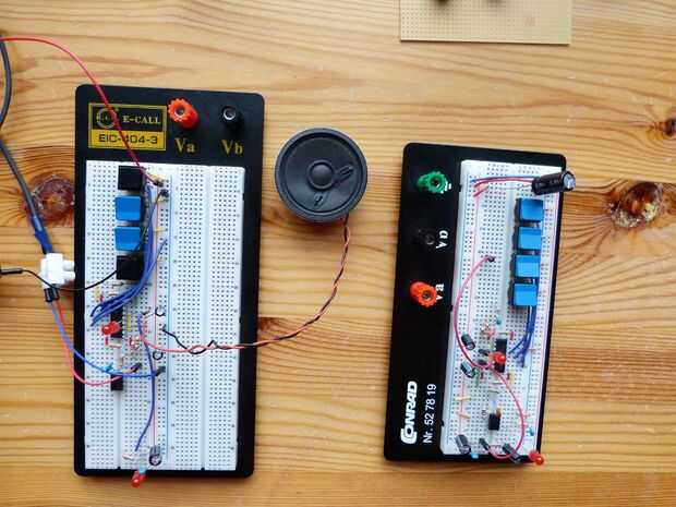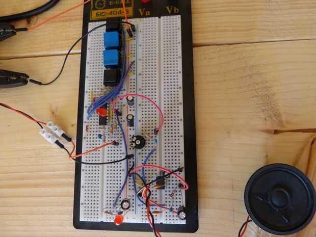Antes de la soldadura de los componentes electrónicos a la Junta de perf siempre construir y probar el circuito en un protoboard. Esto asegura que el circuito electrónico funciona como se espera y componentes se intercambian fácilmente en caso de quiero experimentar con el circuito. Revise cuidadosamente los esquemas al conectar los componentes electrónicos a la protoboard. Este circuito se puede construir en pasos de lo que es menos abrumadora. En primer lugar construir el circuito necesario para que funcione el modulador de voz HT8950A sin el amplificador LM386 e incluso sin conectar pines 2,3,4 y 5 para los botones de interruptor. Cuando esta parte del circuito está lista enchufe el micrófono en el protoboard, o utilizar algún otro audio. Ahora Conecte el altavoz con un cable conectado a la clavija 12 (AUDIO) y otra a tierra. Aplicar alimentación con 3 pilas AAA o utilizar un banco de potencia (4.5V DC). Si todo va bien el modulador de voz debe operar ahora pero sólo en modo de Robot (este es el modo por defecto en el arranque). El LED entre el pin 14 (TS) y el pin 11 (lámpara) se debe oscilar cuando se recibe audio, una señal de que está trabajando el modulador. Debido a su amplificación incorporado el sonido de la HT8950A es audible pero apenas (es mejor cuando se conecta un auricular). Con el trabajo de HT8950A puede mover al siguiente paso. Si esta parte del circuito no funciona cuidadosamente Compruebe los componentes y la forma en que están conectados. Otra vez compararlo con los esquemas.