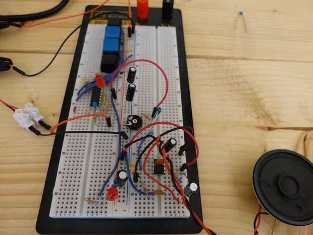 Por último añadir el amplificador LM386. PIN 3 del amplificador está conectado a la salida de la HT8950A. Con el amplificador conectado añadir el altavoz y el circuito de prueba. El volumen del sonido puede controlarse con el potenciómetro de 250 ohmios. En este punto el circuito debe ser completamente funcional y puede mover al siguiente paso.