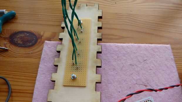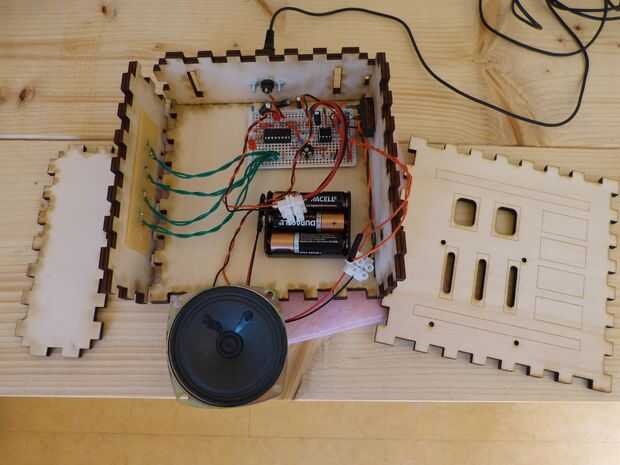 Terminada la soldadura de la Junta de proto perma prueba con el altavoz y entrada de audio conectado. Sin los botones de interruptor de conexión que debe funcionar en modo Robot. Después de la soldadura de los cables desde el interruptor de cuatro botones a los pines 2,3,4 y 5. Finalmente la soldadura de los cables del altavoz, interruptor, portapilas y audio en el tablero de proto perma. La soldadura de estos altavoces, encendido/apagado y el interruptor audio queda al paso. Soporte de la batería puede soldarse a los cables porque se sienta en la caja con la placa.