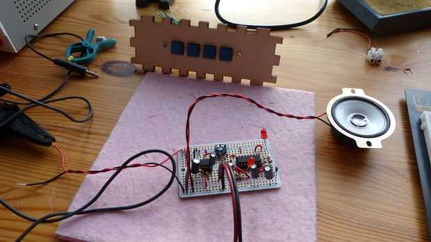 Primero corte la madera perf a un tamaño de 10x2.5cm (4 x 1 pulg) empuje los pernos de los botones de interruptor a través de la Junta de perf y soldar los cables a los pines. Al terminar continuar con la perma proto board (véase la lista de piezas). Coloque la pizarra al lado de la protoboard como se muestra en la imagen de arriba. Puesto que los diseños de la placa y la Junta de proto perma son idénticos simplemente puede copiar lo que se ha hecho en el protoboard. La Junta de soldadura puede hacerse en los mismos pasos como paso anterior descrito. Lugar el zócalo DIP 16 para el HT8950A primero y posteriormente soldar todos los componentes conectados a él. Prueba el HT8950A antes de trasladarse al amplificador LM386 (véase el paso anterior para esto). Utilizan el zócalo DIP-8 para el LM386 en vez del amplificador directamente a la Junta de soldadura. Como una regla siempre soldar un par de componentes y comprobar cuidadosamente (con una lupa si es necesario) antes de pasar.