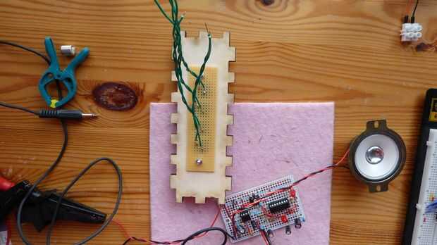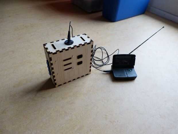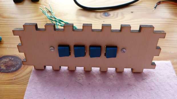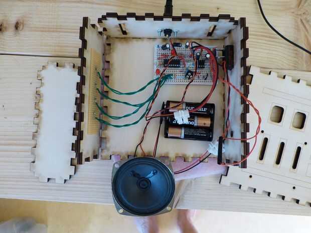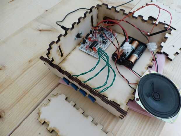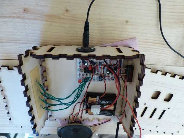 Primero se debe introducir los botones de interruptor que se montan en el tablero de perf en las casillas del panel lateral. Perfore dos agujeros de 3mm a través de la Junta de perf y el panel. El 10x2.5cm perf board puede fijarse ahora en el panel lateral con dos pernos y tornillos de máquina 3x12mm. El altavoz se fija en el frente usando cuatro pernos y tornillos de máquina 3x12mm. El conector de teléfono principal se inserta en el soporte impreso jack 3d. Taladre dos agujeros de 3mm en el panel superior mediante el soporte del gato para la posición de los agujeros. El soporte del gato entonces se fija en el panel superior con dos pernos y tornillo 3x12mm. El perma proto board y el soporte de la batería se sujetan a la pared posterior con dos 3x12mm tornillos y pernos cada uno (otra vez perforar agujeros de 3mm en las posiciones apropiadas). A continuación el altavoz, interruptor SPST y audio estan soldadas a sus respectivos cables. Con todos los componentes a los paneles se pueden pegar el uno al otro. Comenzar con la parte posterior y pegar todos los paneles de lado y uno al otro. Finalmente Inserte el panel frontal. No pegar el panel frontal puede ser utilizado como tablero de servicio en caso de que se requiere acceso a los interiores (por ejemplo, para cambiar las pilas).