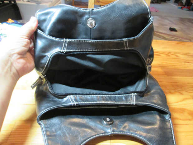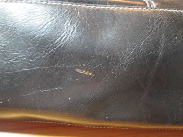 No parece ser de cuero, y reconocí la etiqueta en la bolsa cuando lo compré. La bolsa tenía unas marcas en el exterior y algunas marcas en el interior, pero aparte de eso, estaba en muy buenas condiciones y parecía que no había sido utilizado en un tiempo (deduce los pliegues rígidos en la parte exterior del material de la bolsa).